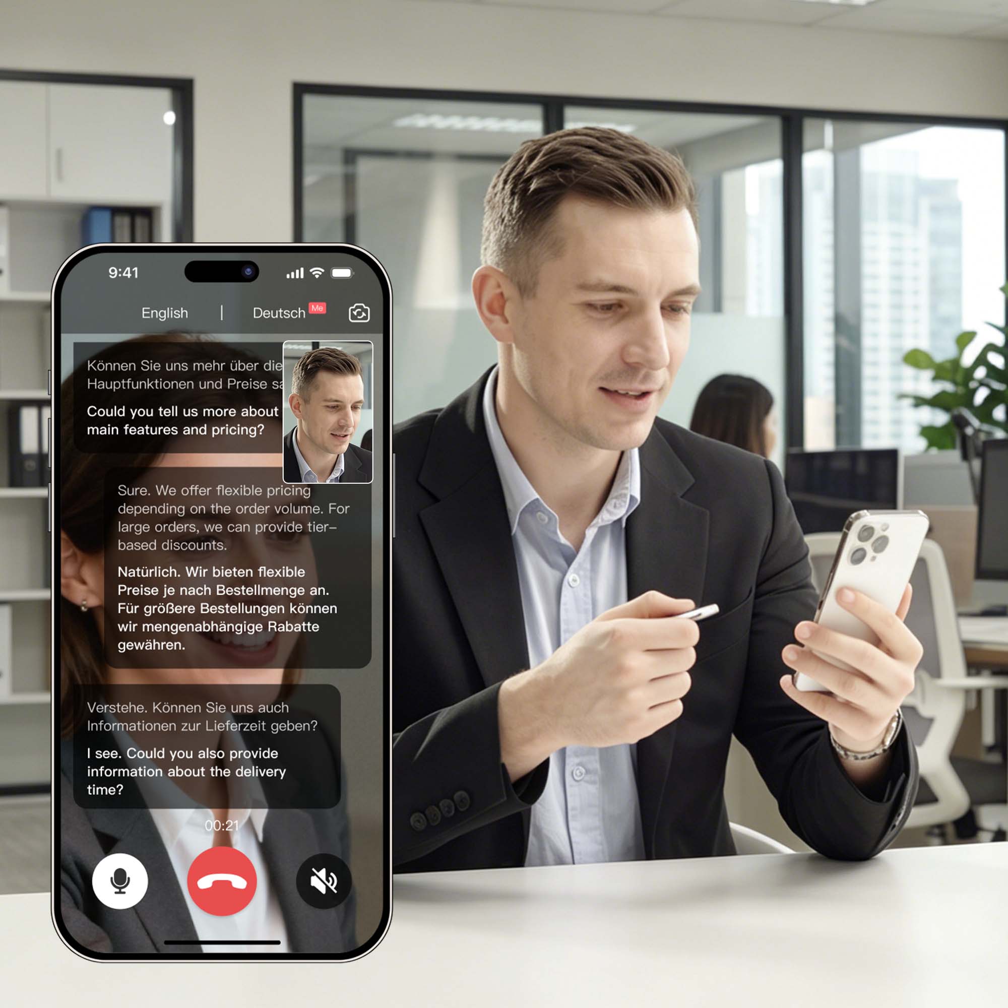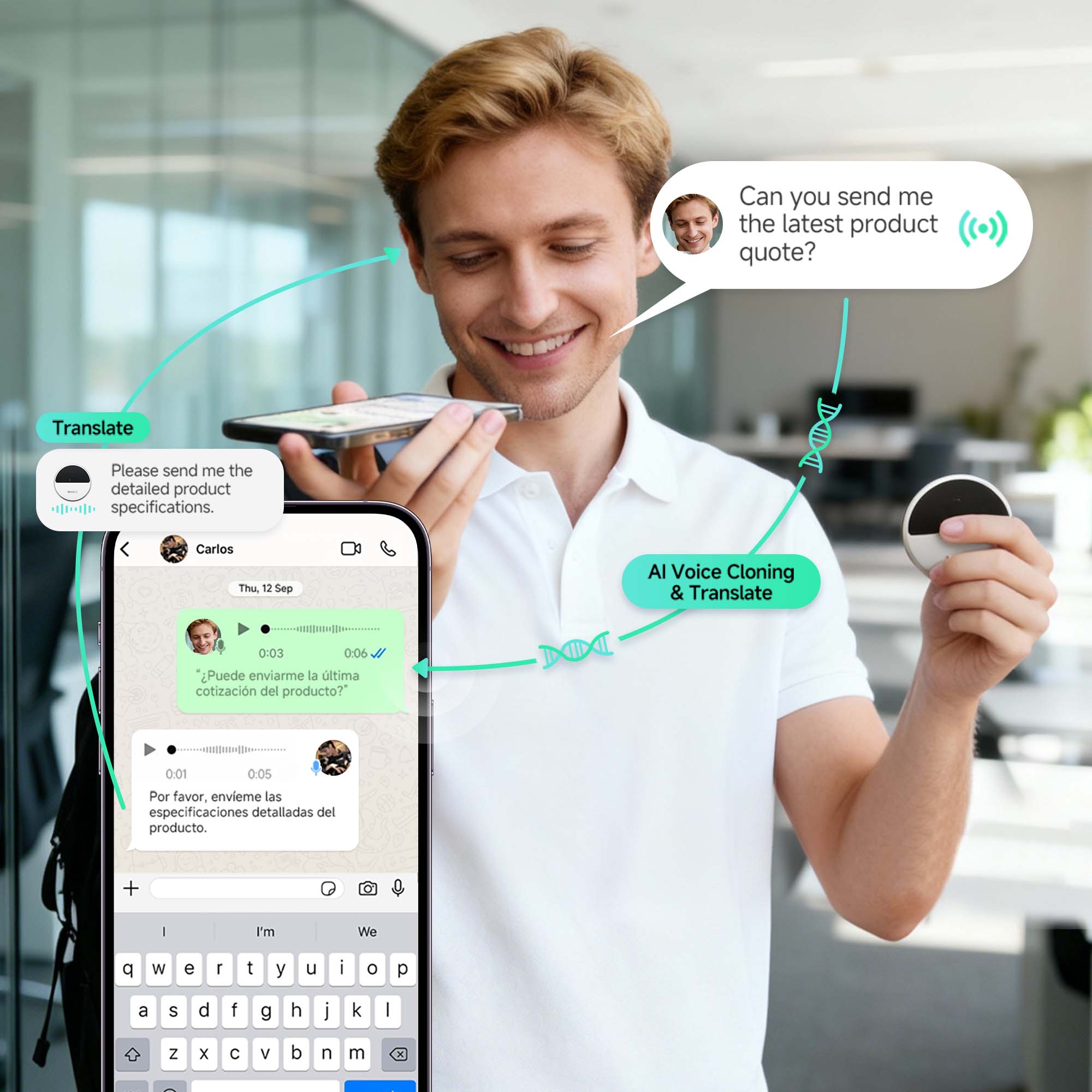 Translate instantly within WhatsApp, Messenger, Instagram, WeChat, and more—without switching apps. Speech converts automatically to text or voice in the recipient’s language. - Voice & Video Call Translation